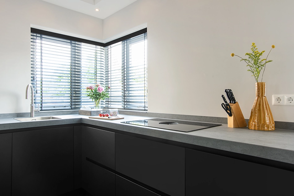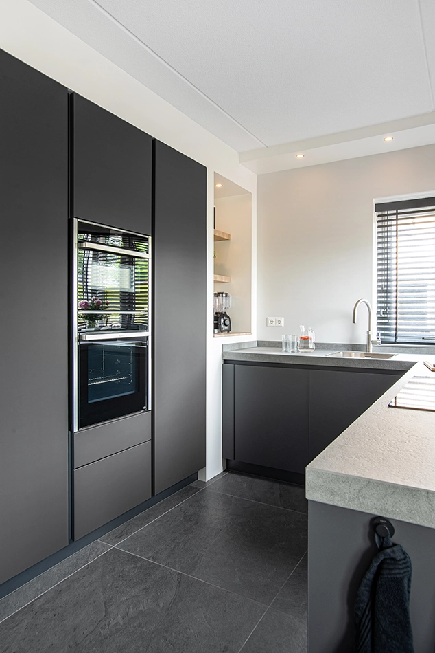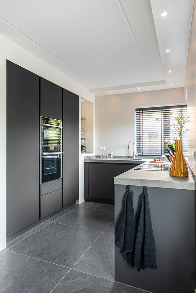 Een stoere keuken is door de donkere kleuren en ruwe materialen helemaal naar eigen wens samen te stellen. Zo kan een open keuken een blikvanger worden met een industrieel eiland. Met een betonlook keukenblad of metalen accenten krijg je ook het gewenste robuuste effect, ook bij een kleine of rechte keuken.