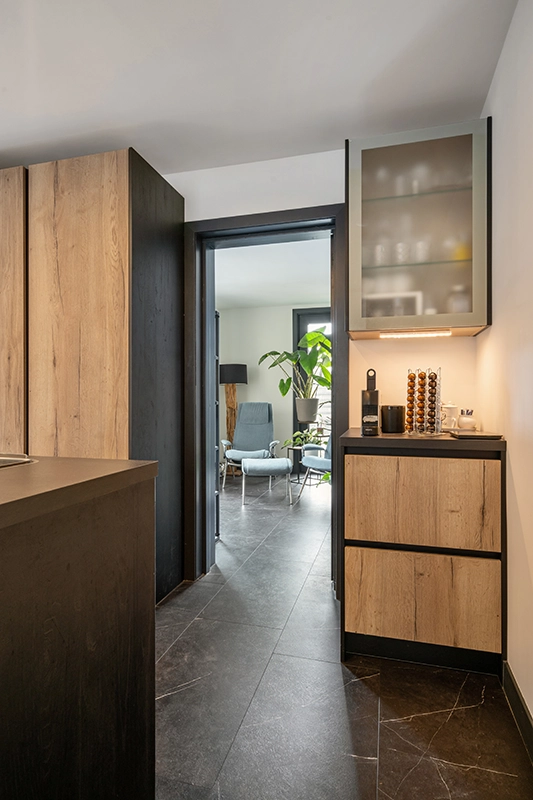 Het sfeervol verlichte subtiele koffiehoekje, compleet met een kastje met melkglas erboven, voegt een vleugje gezelligheid en stijl toe aan de keuken.