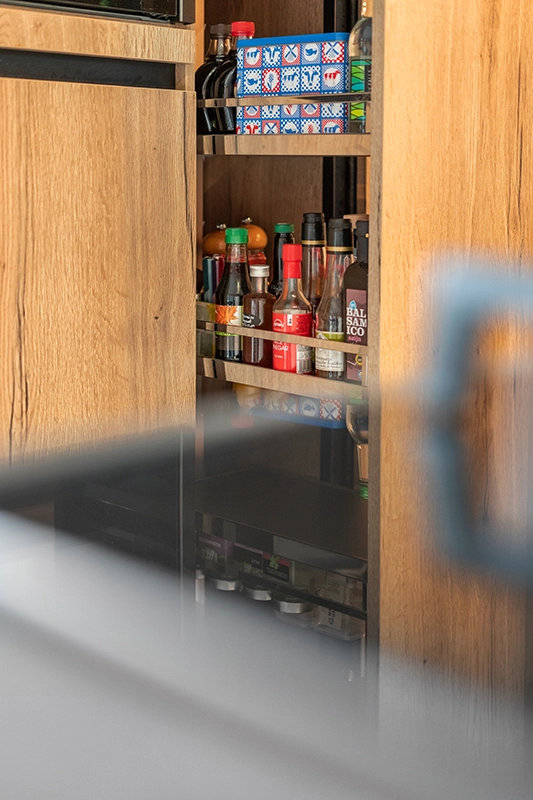 Een opvallende toevoeging is de grote spoelbak in het eiland. Ook was er vraag naar een ruime kookplaat, waar pannen naast elkaar kunnen staan. Met het subtiele koffiehoekje en de handige apothekerskast is er voldoende opbergruimte gecreëerd. De houten elementen dragen bij aan een verbindende sfeer in de keuken.