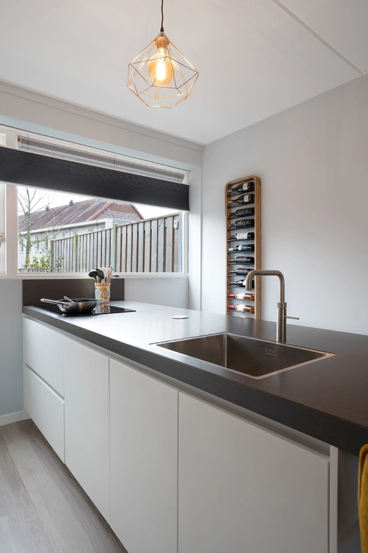 Met een lange wand inclusief een parallel kookschiereiland, is er een naadloze verbinding gecreëerd tussen de woonkamer en de keuken. Dit ontwerp biedt niet alleen voldoende bewegingsruimte in de keuken, maar ook extra opbergruimte. De witte keukenkastjes en het kookschiereiland geven de keuken een ruimtelijk gevoel en maken het tot een sfeervolle plek om te vertoeven.