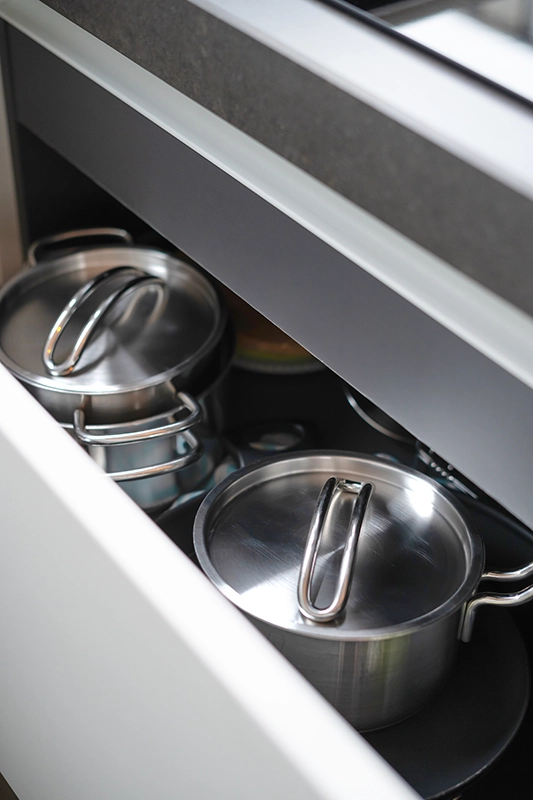 Om extra kastruimte te realiseren, is er slim gebruikgemaakt van ruimtebesparing, zoals het inbouwen van twee ovens en een ruime koelkast. De koffiecorner is voorzien van extra lades en een werkblad, waardoor niet alleen praktisch gebruik wordt gemaakt van de ruimte, maar ook een ruimtelijker gevoel wordt gecreëerd.