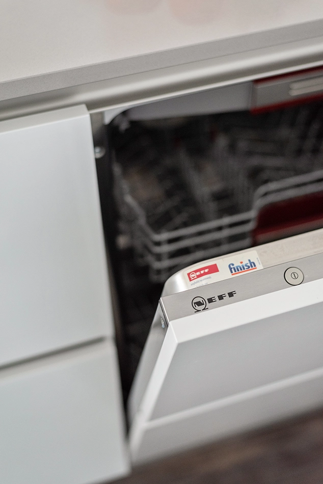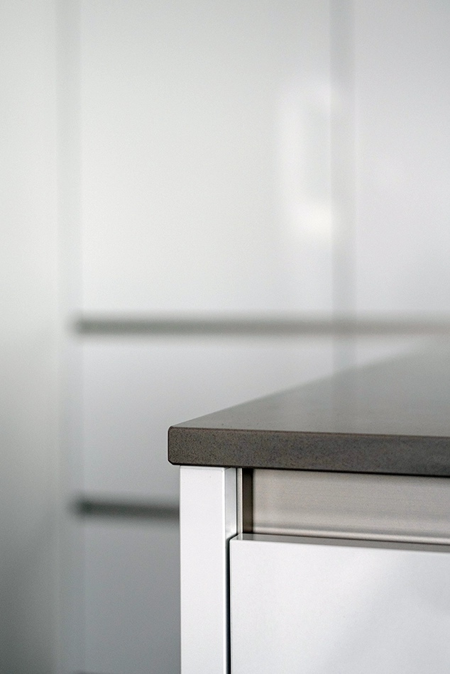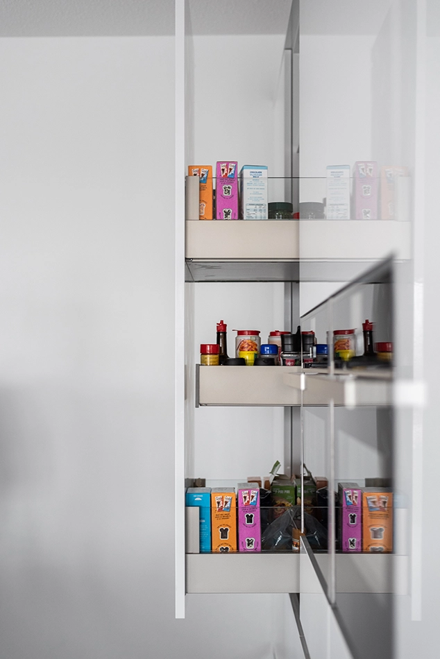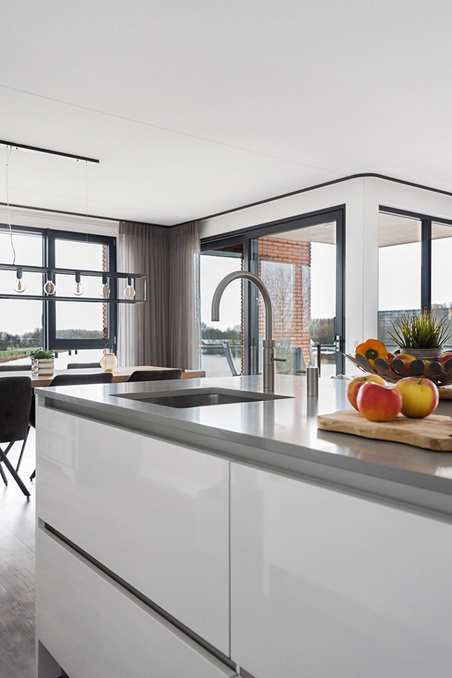 Angelina en Peter kozen voor een gestroomlijnde, hoogglans witte keuken die perfect past bij de stijl van hun woning. De keukenkastjes vullen het interieur naadloos aan. Voor een toegevoegde touch van elegantie selecteerden ze een keukeneiland met een prachtig composiet keukenblad, wat de keukenwerkzaamheden zowel eenvoudiger als bijzonder praktisch maakt.