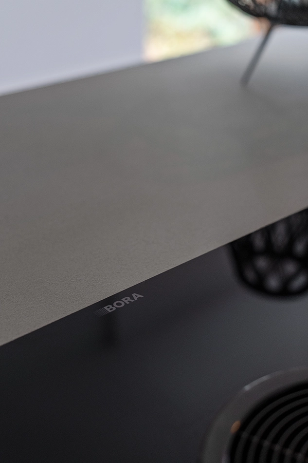 In een tijdloze keuken draait alles om eenvoud. Leo en Daniëlle kozen ervoor om alles strak en netjes te houden, met uitzondering van enkele accessoires. De vijf zwarte inbouwkasten in de muur achter het kookeiland vallen op door hun eenvoud. De grootste uitdaging lag in het kiezen van de juiste apparatuur, waarbij het elegante koffiezetapparaat de enige ‘uitspatting’ is.